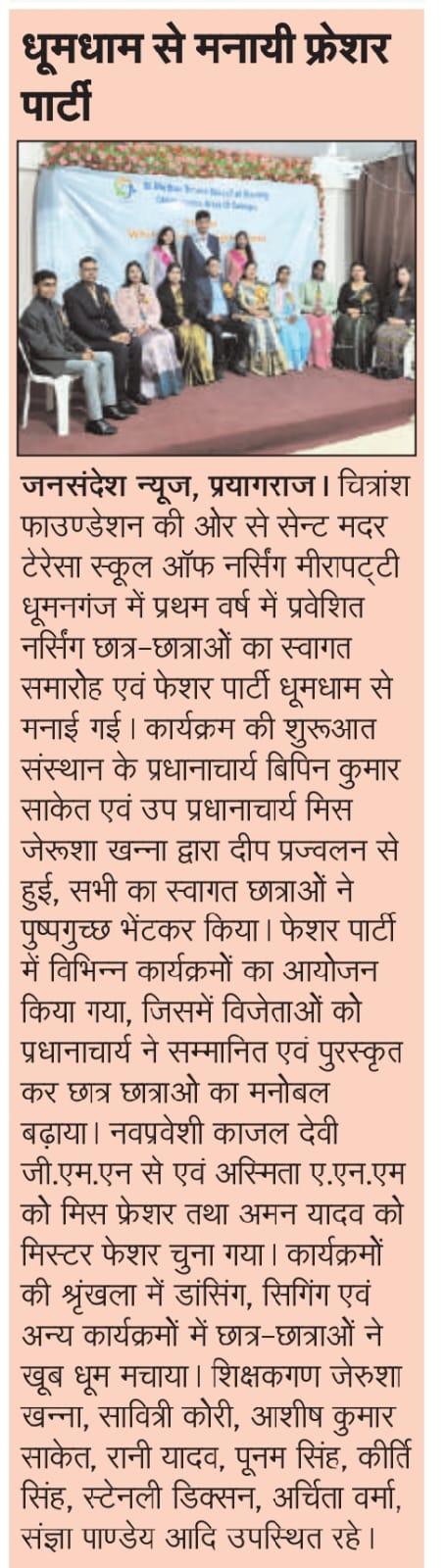 JANSANDESH NEWS MEDIA COVERAGE OF ST. MOTHER TERESA SCHOOL OF NURSING - FOR FRESHER PARTY - 2025